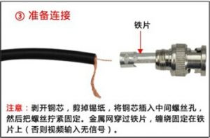 將視頻線剝開,剪掉錫紙,并將銅芯上的絕緣殼剪掉,留出部分銅芯線,屏蔽層的金屬擰成另一條線;把Q9接頭的套筒擰下來,用螺絲松開接頭上的螺絲,將套筒套到視頻線上,視頻線同心軸插到接頭的同心孔,螺絲擰緊,并且將金屬網絲穿過鐵片固定到接頭鐵片上,將鐵片包在視頻線上用鉗子夾緊,擰上套筒就完成接頭安裝了,如下圖: